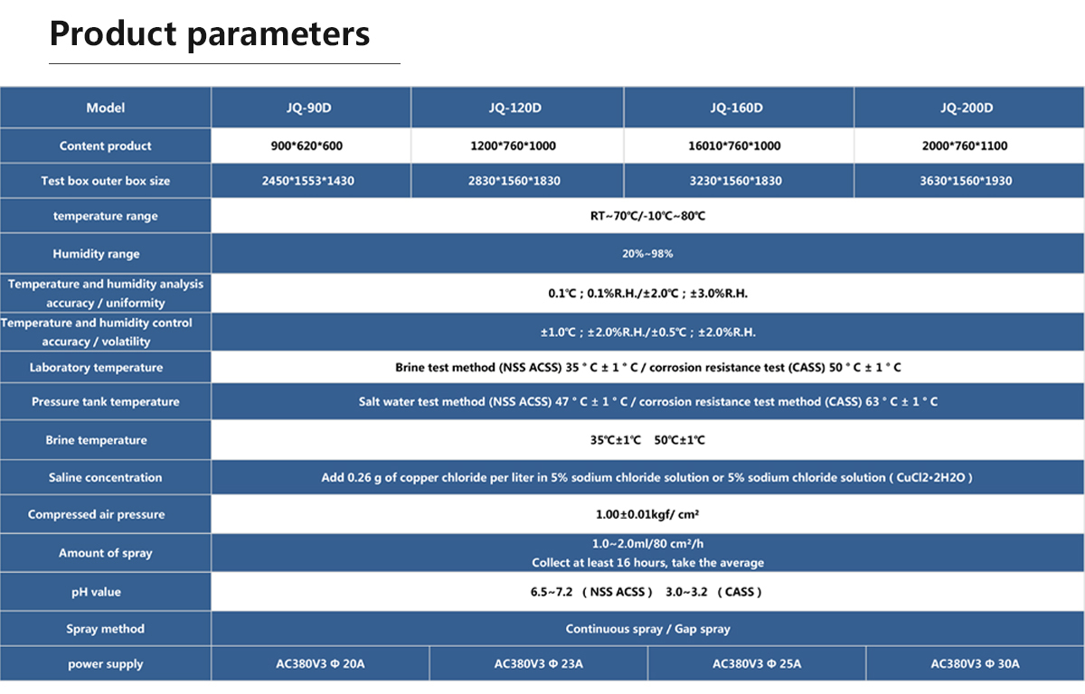 Chamber temperature | Salt water test method (NSS ACSS) 35 ° C ± 1 ° C / corrosion resistance test method (CASS) 50 ° C ± 0.1 ° C | ||||